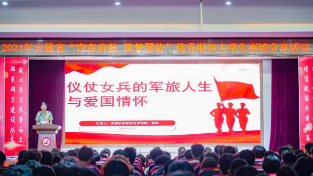 5月19日,2024年安徽省“青春启航 筑梦国防”优秀退伍大学生事迹分享活动在安徽机电职业技术学院顺利举办。学院党委委员、副院长姜绳,团省委学校部部长、省学联秘书长邹永生,省青少年发展基金会秘书长、省希望工程管理委员会办公室主任李永军,团芜湖市委副书记陶涛,学院武装部部长叶红辉,学院团委书记樊卫强以及师生代表共计360余人参加线下活动,8000余名学生通过线上直播观看了活动。