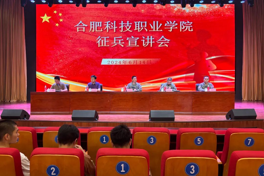 为进一步增强青年学子国防意识,普及征兵政策,鼓励广大学生积极投身国防事业,合肥科技职业学院6月14日在学院学术交流中心报告厅隆重举行了征兵宣讲会。出席本次会议的有肥西县人武部副部长代颂贤,政工科科长胡朝永,山南镇武装部副部长刘谋权,学院党委委员、学生处处长、征兵工作站站长范胜锋。会议由校征兵工作站干事严明强主持。