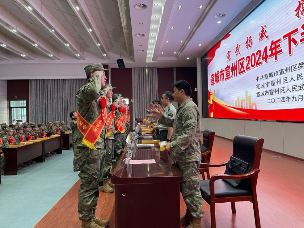 9月14日,宣城市宣州区在市国防动员训练基地举行“宣武扬威 携笔从戎”新兵欢送大会。区委常委、常务副区长曹俊出席大会并讲话。区人武部部长纵壮志主持会议,政委冯琰出席大会。