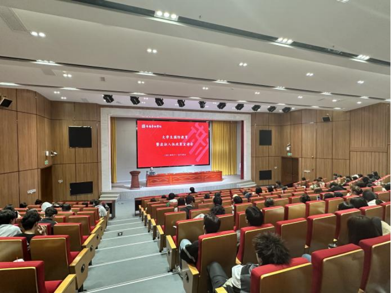 楚金金向同学们做《何为光荣,你的选择就是答案暨大学生征兵政策解读》讲座,就为什么要参军、大学生征兵政策等进行详细解读。他向同学们介绍了征兵工作的深刻内涵和重要意义,并就大学生入伍优惠政策、毕业生和在校生入伍的区别、户籍地和学校所在地入伍的区别等问题进行详细解读。他号召同学们积极投身国防事业,将个人价值追求与国家建设紧密结合,在实现中国梦的伟大征程中实现自己的理想抱负,书写辉煌的人生篇章。