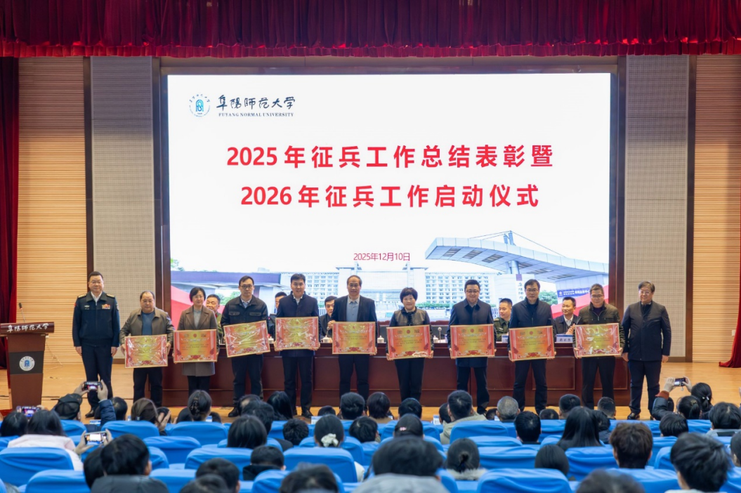 近日,阜阳师范大学2025年征兵工作总结表彰暨2026年征兵工作启动仪式在西湖校区召开。校党委书记程曦,阜阳军分区徐春,校党委常委、副校长窦贤琨,阜阳军分区吴小平,颍州区人武部赵刚出席会议,学校征兵工作领导小组成员单位负责人,二级学院党委(党总支)书记、副书记,全体专兼职辅导员,各二级学院征兵工作联络员,毕业班学生代表和学生军事类兴趣社团成员600余人参加。