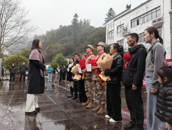 乡政府广场上,《强军战歌》《好男儿就是要当兵》等激昂的军旅歌曲循环回荡,振奋人心。全体乡干部早已整齐列队、严阵以待,用最饱满的热情迎接新兵们的到来。乡党委主要负责同志为即将奔赴军营的两名新兵送上鲜花,向他们致以热烈的祝贺和崇高的敬意并深情寄语,希望他们珍惜军旅时光,牢记家乡人民的嘱托与期望,在部队中严格要求自己,刻苦训练、锤炼本领,把家乡的红色基因和奋斗精神带到军营,在国防建设的广阔舞台上建功立业。两名新兵身姿挺拔、神情坚毅,向乡领导和家乡人民郑重表态,将不负厚望、不负韶华,在军营中刻苦磨砺、奋勇争先,以青春之力践行参军报国的初心使命。