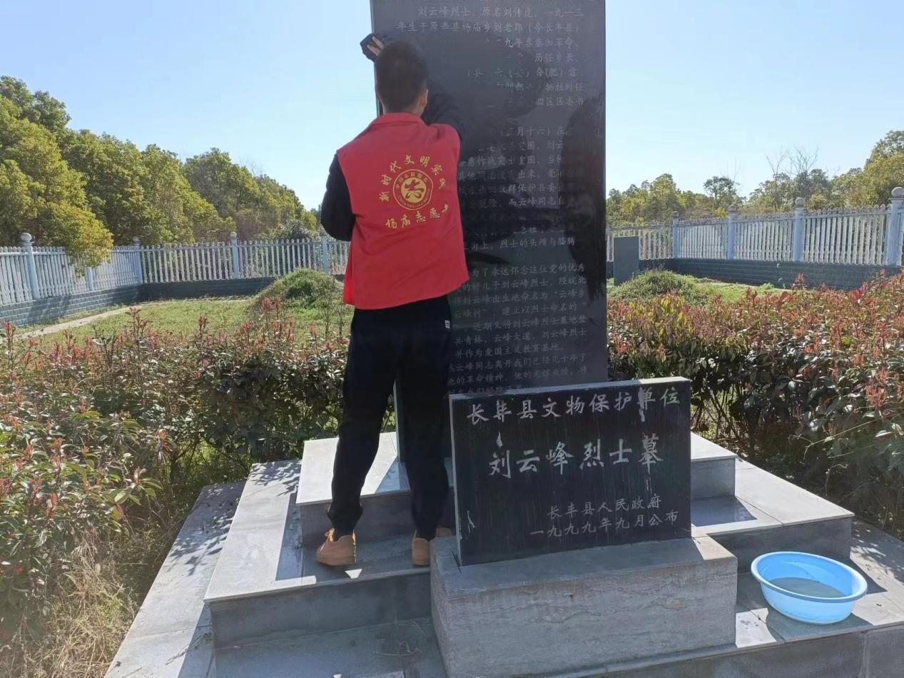 巍巍青山埋忠骨,朵朵白花献英灵。革命的胜利来之不易,是无数先烈用鲜血和生命换来的,在烈士墓前,所有志愿者们庄严肃立,默哀致敬。大家手持铁铲、扫把、抹布等工具,怀着崇敬的心仔细清扫烈士墓周边的落叶杂物,清除角落的杂草,铲除地面上的青苔及淤泥,轻轻擦洗烈士纪念碑。清理完毕后,烈士纪念碑焕然一新,整体面貌庄重严肃,充分展现出对烈士的无尽哀思和敬仰。