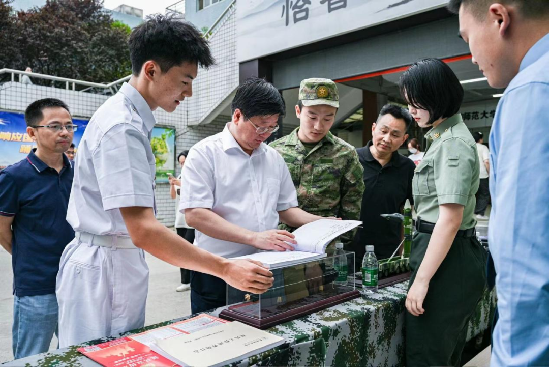 活动现场布置了醒目的宣传海报、专业化的咨询台、逼真的军事模型和内容详实的宣传展板,吸引了众多大学生的目光。“八一社”的退役大学生们身着军装,化身宣传大使,现场向大学生发放了宣传材料,向前来咨询的大学生分享自己的军旅经历,耐心细致地解答同学们对征兵政策的各种疑问,并从入伍条件、报名流程、优待政策等方面,向有入伍意向的大学生进行了宣传动员,为同学们提供了一站式咨询服务。
