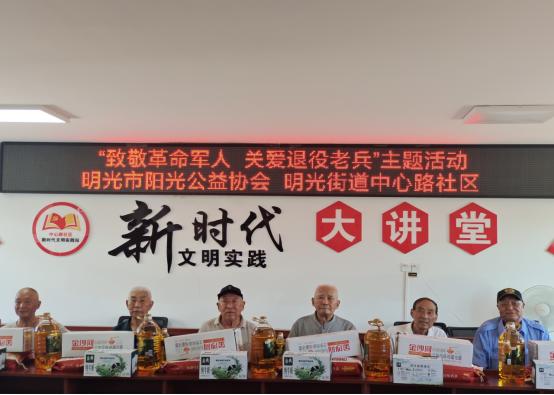在“八一”建军节前夕,7月28日下午,明光市明光街道中心路社区党总支联合明光市阳光公益协会开展了以“致敬革命军人 关爱退役老兵”为主题的公益活动,慰问高龄退役老兵,为他们送去节日的祝福,并为他们送上米、油、挂面、牛奶等物品,把党和政府的关怀和温暖带到他们的心中。