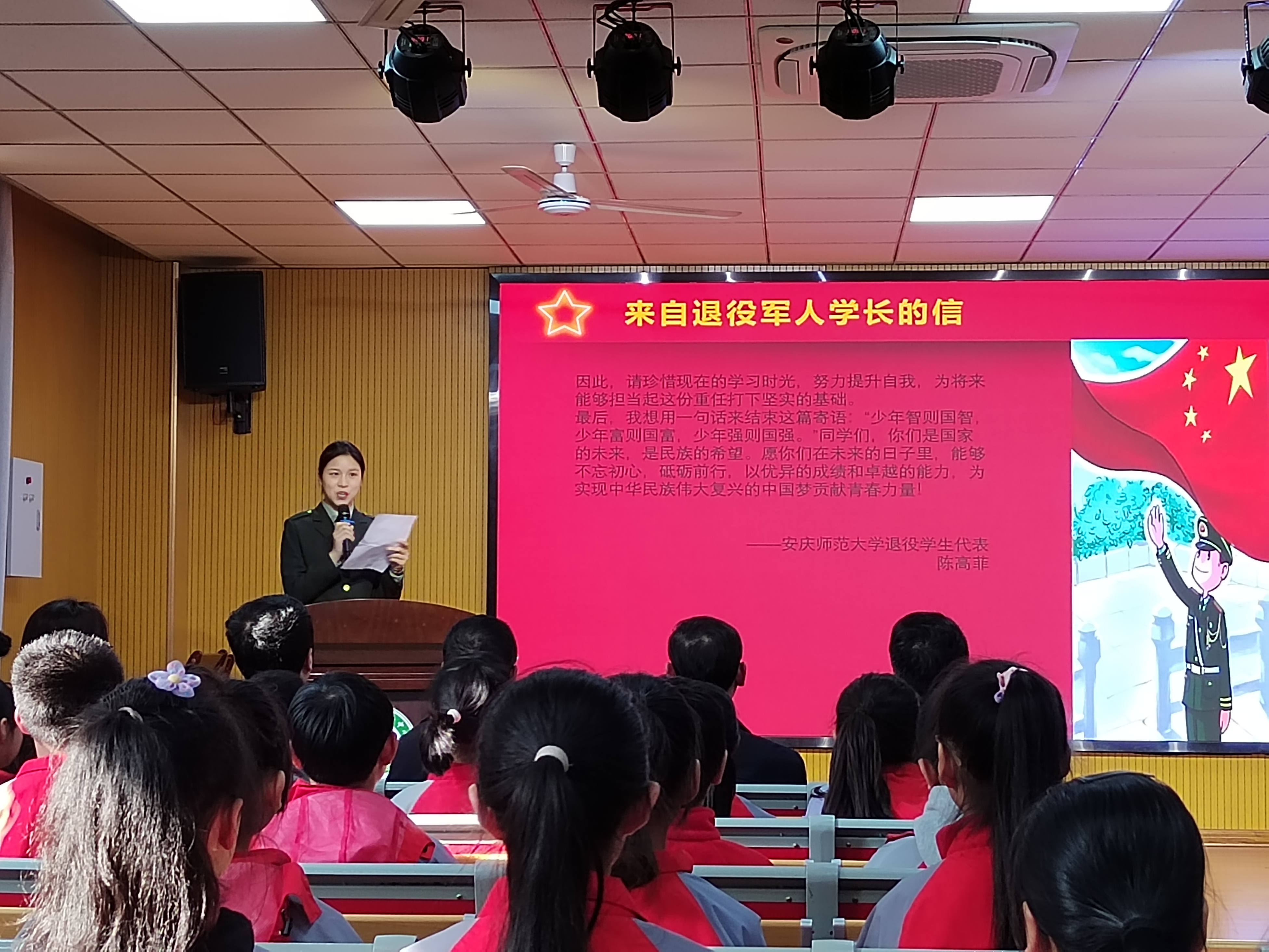 活动围绕三封信和聆听“陈家三父子”的故事开展,退役军人陈高菲学姐现场诵读自己写给小同学们的书信,她勉励同学们在学习的道路上要坚定理想信念,要有吃苦耐劳的精神,在班集体中要做到团结协作,勇于担当,将来为实现中华民族的伟大复兴贡献自己的力量。接着大家跟随国防班班长罗永刚的讲述,再次重温“陈家三父子”和“两弹元勋”邓稼先的故事。学生代表尹瑞涵同学现场诵读写给祖国妈妈的一封信。该同学用真挚的语言和深情地诵读,表达着对祖国母亲的浓浓的爱。活动最后,国旗仪仗队的哥哥姐姐们给小同学们展示了齐步走、正步走、跑步走等专业的军训内容,同学们掌声不断,大家对近距离目睹军人的风采感到激动不已。