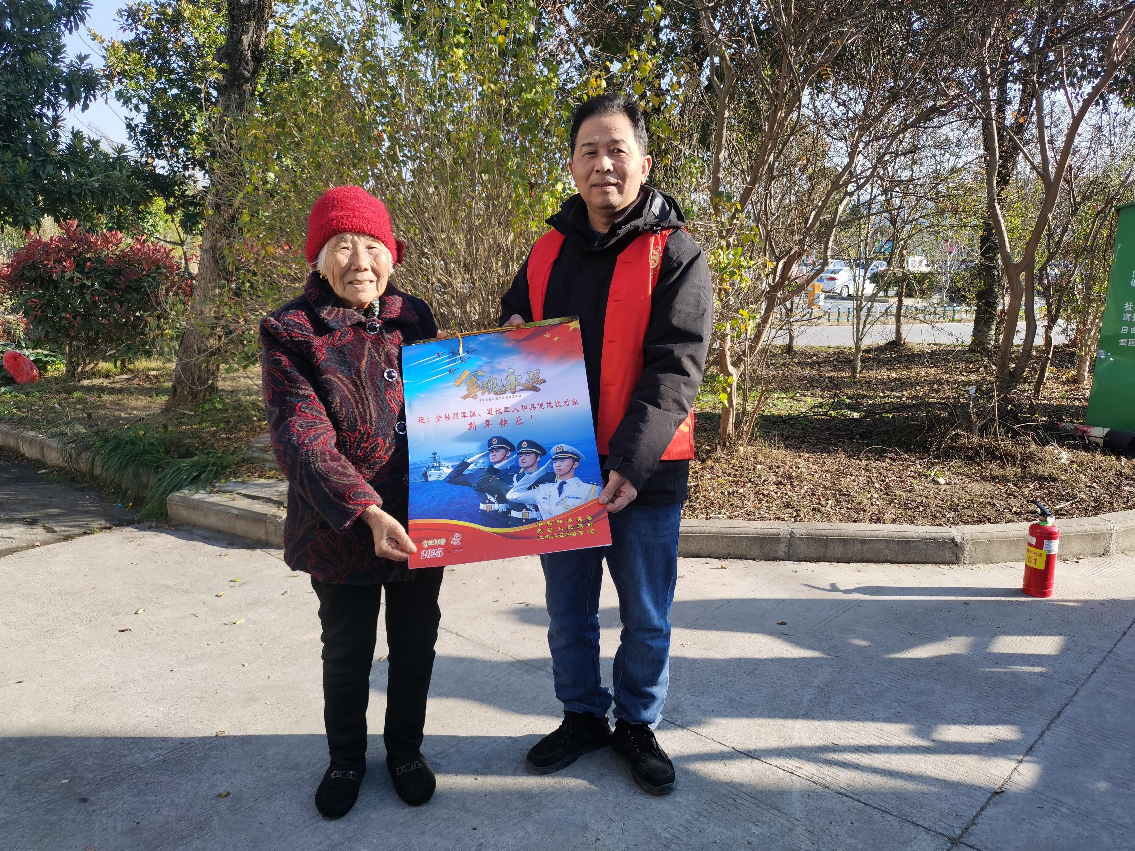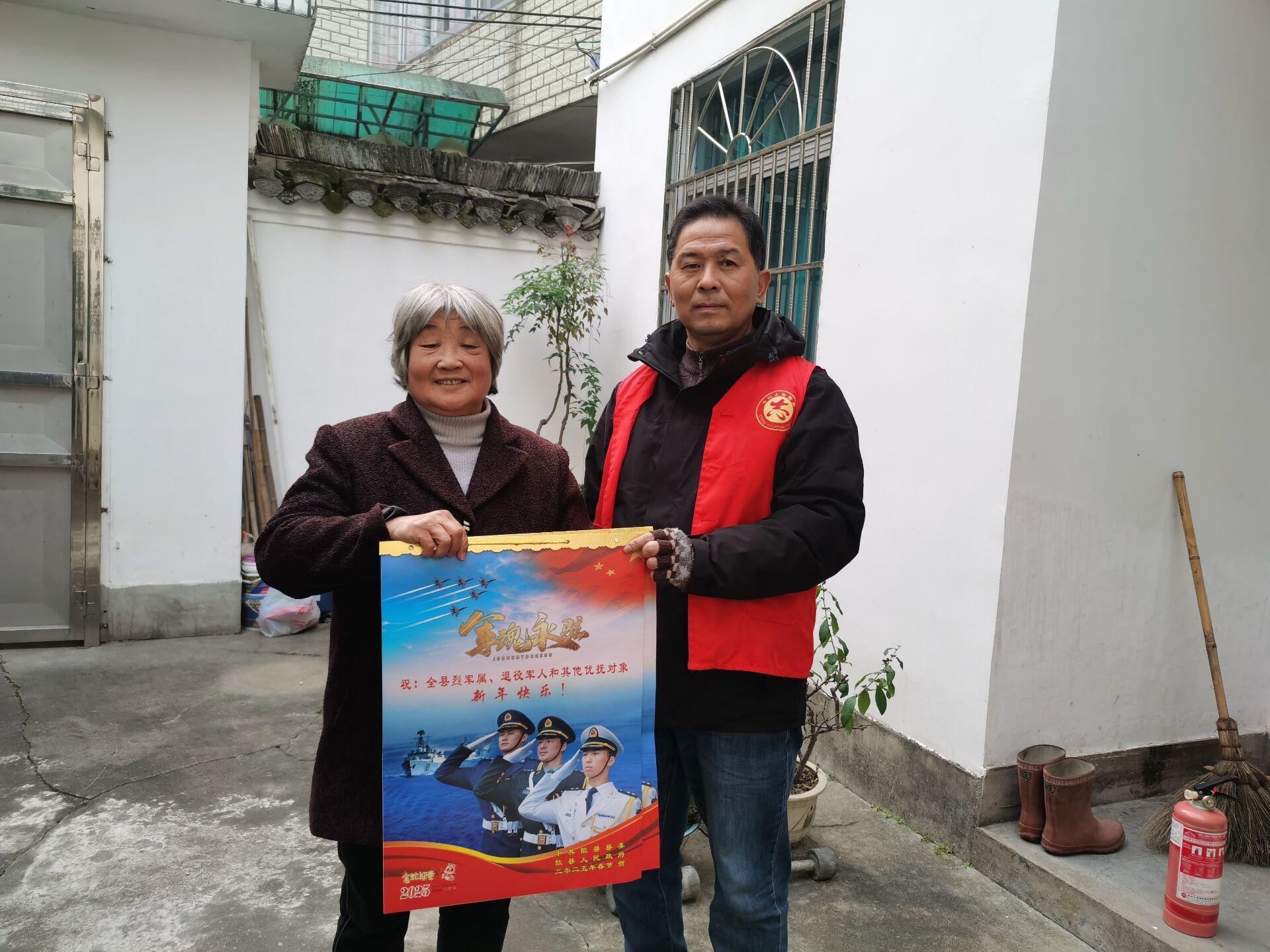 收到2025年年画挂历,家住徽城镇新州居民小区的退役军人叶星说:“谢谢社区对我们军属的关心,为我们送上新年的祝福,作为一名退役老兵,我很自豪。社区每年给我送的年画我都保存着,我感到无比光荣!”12月19日,歙县徽城镇新州社区组织开展“年画送祝福,尊崇暖人心”走访慰问活动,为现役军人家属、退役军人和优抚对象送去年画和慰问。
