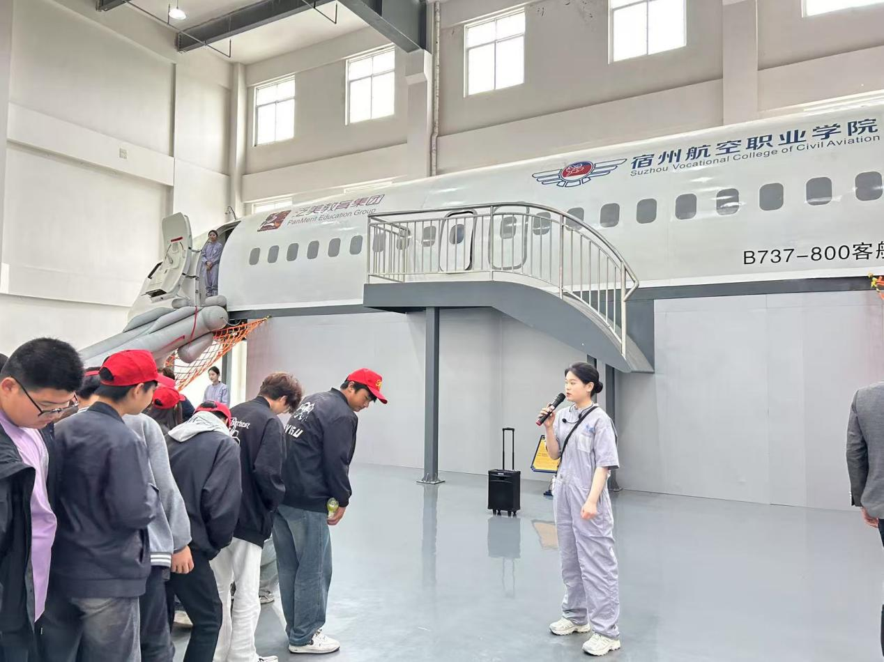 随后开展的客舱安全课程,同样让学生们收获满满。他们围坐在模拟客舱内,专注聆听民航服务规范讲解,并不时拿出小本子记录要点。在实操环节,学生们争相上手,认真学习氧气面罩、救生衣等安全设备的正确使用方法。有的同学还主动当起 “小老师”,帮助同伴纠正动作,在互帮互助中提升了安全意识与应急能力。