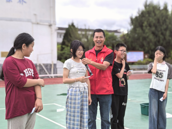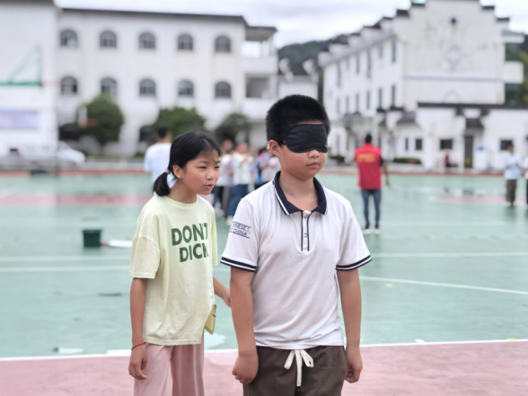 紧接着的“背后的守护者”游戏,将现场氛围推向高潮。学生两两分组,一人蒙上双眼成为“探索者”,在黑暗中小心翼翼;另一人充当“守护者”,紧紧陪伴着伙伴,耐心引导其跨越想定障碍物。“慢慢走,前面有障碍,左转。”“别慌,我在你身边。”温馨提示声不绝于耳。之后进行角色互换,当游戏结束,两两搭档的孩子紧紧相拥,眼中满是感动与信任,他们真诚地向对方道谢。通过亲身体验,孩子们深刻感受到被帮助的温暖,也更理解那些平日里默默付出、不为人知的善意同样值得感恩与铭记。