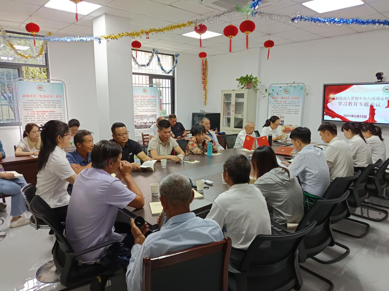 当天上午,全体党员在社区会议室学习《习近平关于加强党的作风建设论述摘编》,深入交流学习心得,认真查摆自身在作风方面存在的问题,进一步强化廉洁自律意识与为民服务的宗旨观念 。新桥社区党总支书记张家礼说:“上午在二陈读书处,看到陈延年同志批注的‘务实’二字——咱们学规定,就得像他们做学问一样,把‘严’的要求翻译成怎么帮辖区孤弱势群体渡过难关。”他打开“吃茶话事”和“‘逢四说事’书记接待日”建议台账说:“上周有居民来社区反映三义组居民陈某某,因常年患病,致使家里负债累累,我们要把学习成果转化为为民办实事的具体行动,我们明天就组织爱心‘365’公益组织去慰问该户。”
