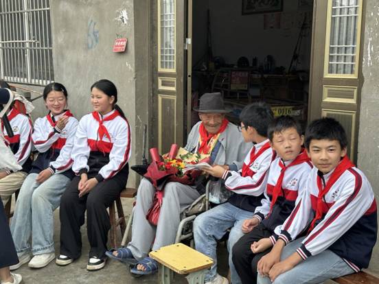 在朱圩村,少先队员们向99岁高龄的抗战老兵卢灿祥敬献鲜花、佩戴红领巾。卢老1926年出生,1944年入伍,是该县健在的抗日老战士。抗日战争胜利后,他又投身解放战争,历经大小战役数十次,两次负伤。尽管腿脚不便,但当回忆峥嵘岁月时,老人眼中依然焕发神采。他动情地讲述起华东战场的经历,甚至唱起当年的歌谣:“华东战场打胜仗,胜利消息传四方……最后一个胜仗这一仗打了一个月零一天,牺牲了两万多,牺牲了两万多……”声音中带着哽咽。