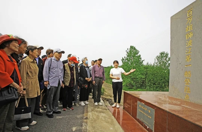 抵达渡江纪念碑前,纪念碑高耸入云,庄严肃穆,碑身上的“百万雄师渡江第一船登陆点纪念碑”几个大字在阳光照耀下格外醒目。在纪念碑前,一位老兵感慨地说:“当年先辈浴血奋战,就是为了让后代过上好日子。如今看到国家繁荣昌盛,我们感到无比欣慰。希望年轻人能铭记历史,珍惜现在的幸福生活。”