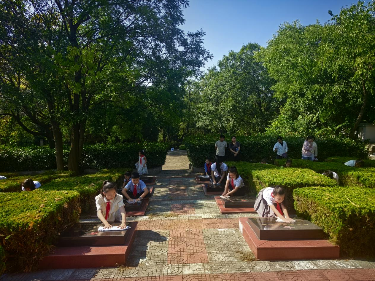 聘任仪式结束后,14 名“薪火”少年宣讲员在烈士陵园工作人员的带领下,前往烈士墓区开展瞻仰活动。在庄严肃穆的烈士墓碑前,孩子们手持抹布,小心翼翼地擦拭着墓碑上的灰尘,每一个动作都饱含对英烈的崇敬之情。工作人员向孩子们详细讲述了革命英烈的英勇事迹,孩子们静静聆听,不时驻足凝视墓碑上的名字,深刻感悟今天幸福生活的来之不易。活动最后,全体人员向革命英烈三鞠躬,以此表达对英烈的缅怀与敬意。