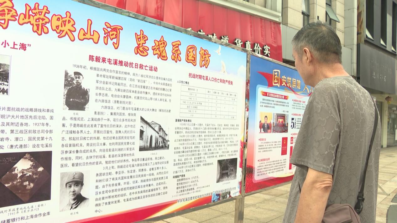 本次展览以“弘扬抗战精神 共筑国防长城”为主题,分为“弘扬抗战精神”和“共筑国防长城”两大篇章,共七个版面,从理论到实践,回顾了在中国共产党领导下人民军队的光辉历程和峥嵘岁月,展示了屯溪区深入学习贯彻习近平强军思想的生动实践。现场工作人员向市民与学生讲解展板,在场的市民听得津津有味,学生们认真听讲,积极应答。