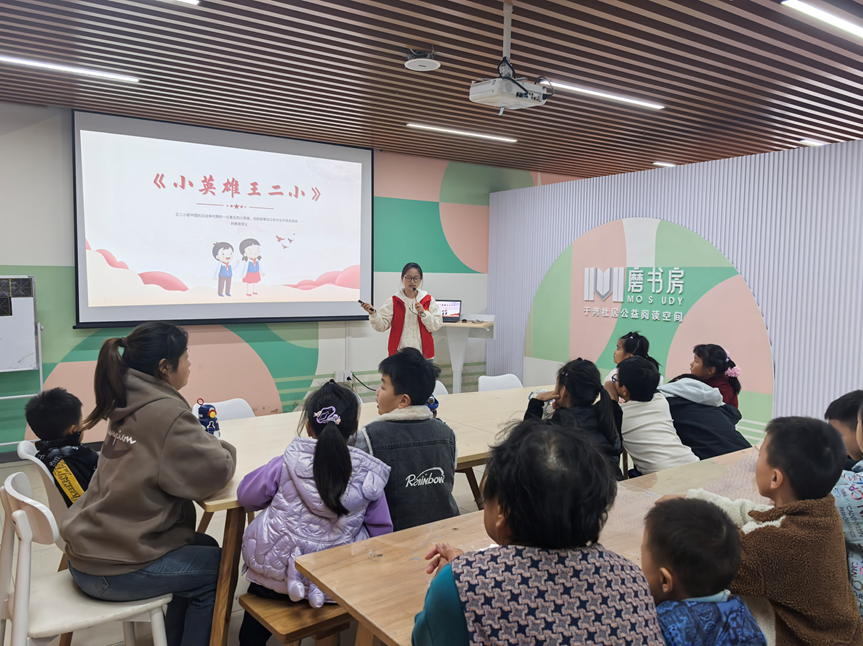 “看呐!小英雄王二小高擎红缨枪冲锋而来!”随着合肥幼儿师范学院志愿者充满激情的旁白回荡,合肥磨店社区于湾社居磨书房内瞬间爆发出雷鸣般的掌声。10月26日,这场由磨店社区于湾社居委、于湾社居退役军人服务站携手合肥市庐阳区实践家社会服务发展中心精心策划的红色主题活动,正以最鲜活生动的形式,在孩子们纯真的心田播撒下革命的火种,让红色基因在新时代的土壤中绽放出更加璀璨的光彩。