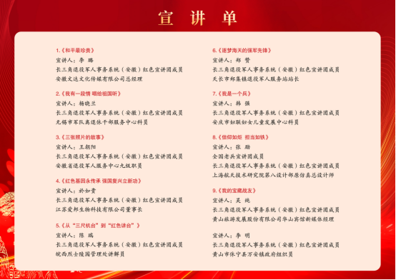 据了解,长三角退役军人事务系统(安徽)红色宣讲团是由安徽省退役军人事务厅牵头,依托各级退役军人服务中心(站)组建的一支专业宣讲团,宣讲团成员由退役军人中的功臣模范、参战参试老兵、英烈讲解员、军队离退休干部、“兵支书”、“军创企业家”等先进典型组成。(戴海云)