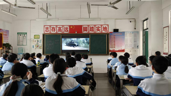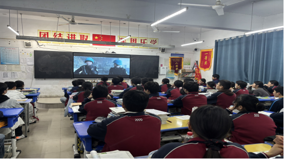 观影过程中,全体学生以庄重认真的态度投入观看。教室里秩序井然,学生们全神贯注地跟随影片节奏,时而为维和队员的惊险任务揪心,时而为中国军人的责任担当动容,浓厚的爱国氛围在各班悄然流淌。影片中一个个鲜活的故事、一句句铿锵的誓言,让学生们直观感受到和平的来之不易,也深刻体会到个人与国家同呼吸、共命运的深刻联结。